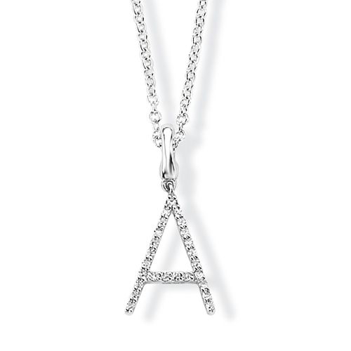 A diamond initial charm / pendant, in the form of the letter 'A', mounted in 9ct white gold, combined weight of diamonds 0.06-0.08 ct*, with hinged loop enabling interchangeable use as a pendant or bracelet charm, length excluding pendant loop 1.2 cm. 9ct white gold tracelink chain sold separately £195