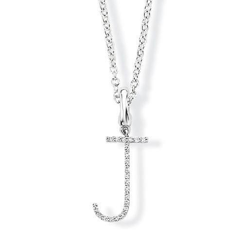 A diamond initial charm / pendant, in the form of the letter 'J', mounted in 9ct white gold, combined weight of diamonds 0.06-0.08 ct*, with hinged loop enabling interchangeable use as a pendant or bracelet charm, length excluding pendant loop 1.2 cm. 9ct white gold tracelink chain sold separately £195