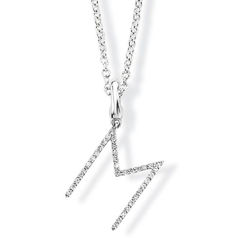 A diamond initial charm / pendant, in the form of the letter 'M', mounted in 9ct white gold, combined weight of diamonds 0.06-0.08 ct*, with hinged loop enabling interchangeable use as a pendant or bracelet charm, length excluding pendant loop 1.2 cm. 9ct white gold tracelink chain sold separately £195