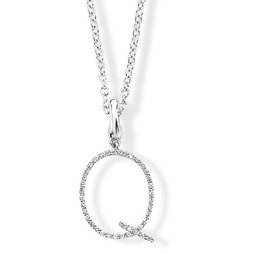 A diamond initial charm / pendant, in the form of the letter 'Q', mounted in 9ct white gold, combined weight of diamonds 0.06-0.08 ct*, with hinged loop enabling interchangeable use as a pendant or bracelet charm, length excluding pendant loop 1.2 cm. 9ct white gold tracelink chain sold separately £195