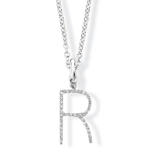 A diamond initial charm / pendant, in the form of the letter 'R', mounted in 9ct white gold, combined weight of diamonds 0.06-0.08 ct*, with hinged loop enabling interchangeable use as a pendant or bracelet charm, length excluding pendant loop 1.2 cm. 9ct white gold tracelink chain sold separately £195