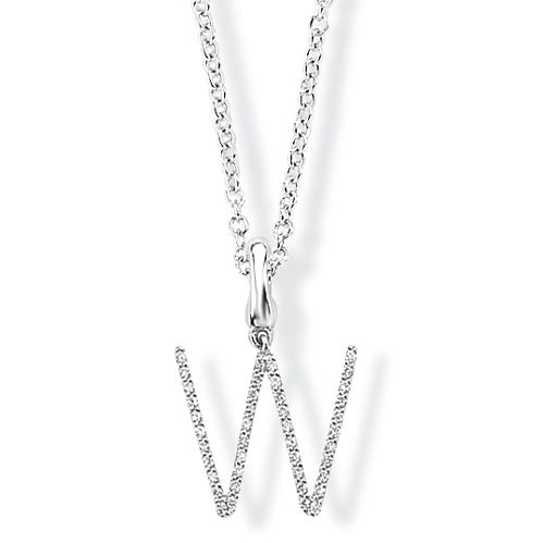 A diamond initial charm / pendant, in the form of the letter 'W', mounted in 9ct white gold, combined weight of diamonds 0.06-0.08 ct*, with hinged loop enabling interchangeable use as a pendant or bracelet charm, length excluding pendant loop 1.2 cm. 9ct white gold tracelink chain sold separately £195